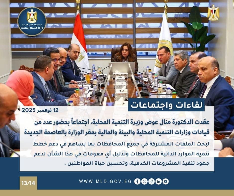 عقدت الدكتورة منال عوض وزيرة التنمية المحلية، اجتماعاً بحضور عدد من قيادات وزارات التنمية المحلية والبيئة والمالية بمقر الوزارة بالعاصمة الجديدة وذلك فى إطار متابعة تنفيذ توجيهات رئيس مجلس الوزراء فى اللقاء الذى عقده نهاية شهر أكتوبر الماضي بحضور وزيري التنمية المحلية والمالية لبحث الملفات المشتركة في جميع المحافظات بما يساهم في دعم خطط تنمية الموارد الذاتية للمحافظات وتذليل أي معوقات في هذا الشأن لدعم جهود تنفيذ المشروعات الخدمية، وتحسين حياة المواطنين وتلبية الاحتياجات العاجلة في تقديم بعض الخدمات الأساسية للمواطنين.
