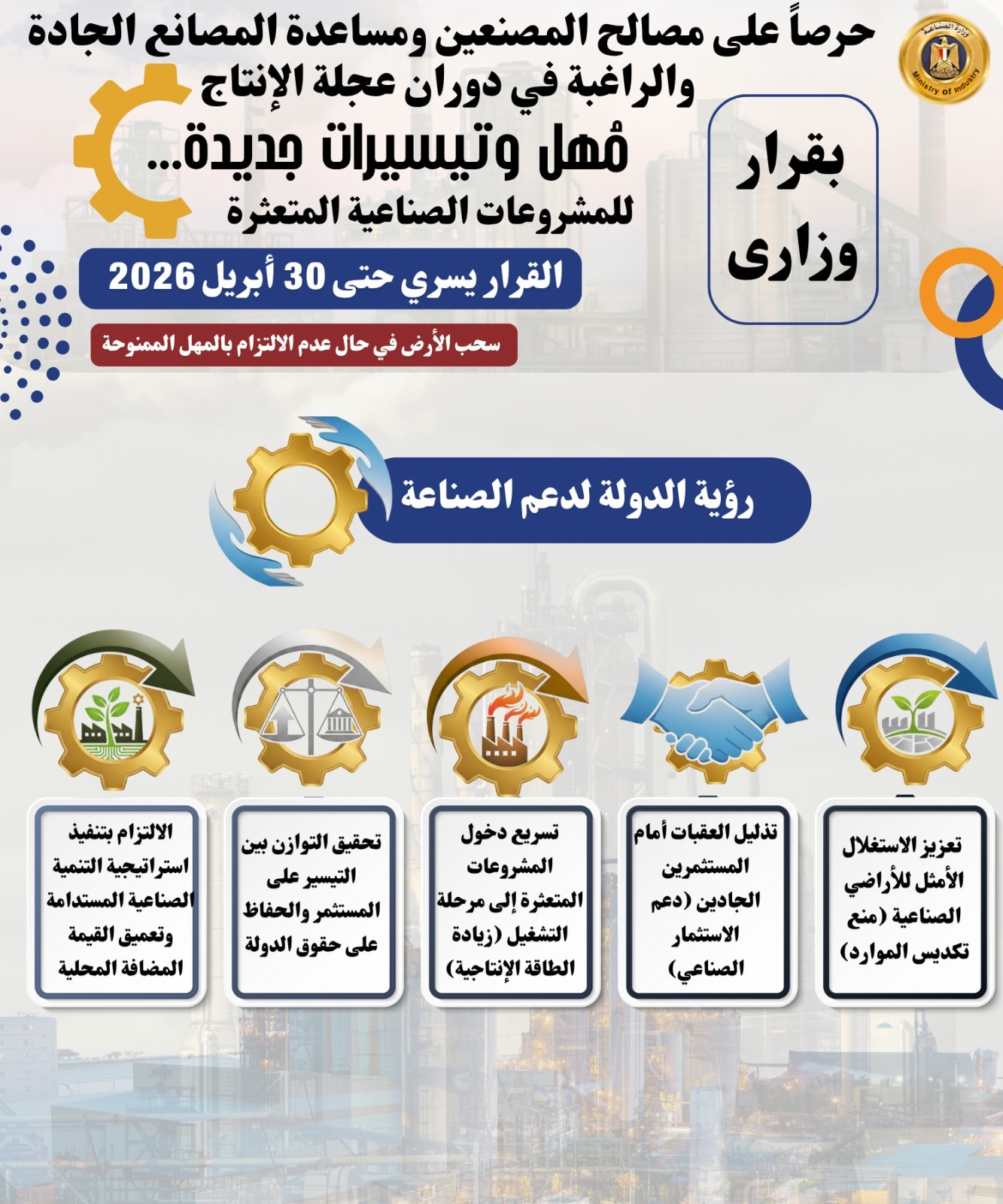 وتسري هذه المهل والتيسيرات التي ستنفذها الوزارة ممثلة في الهيئة العامة للتنمية الصناعية حتى 30 أبريل 2026 وتشمل:
