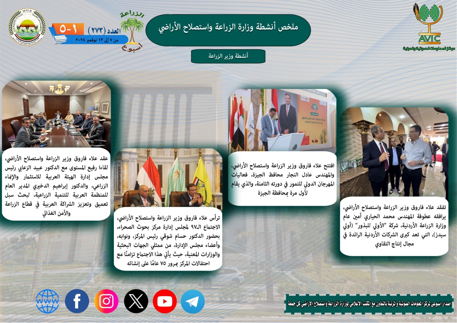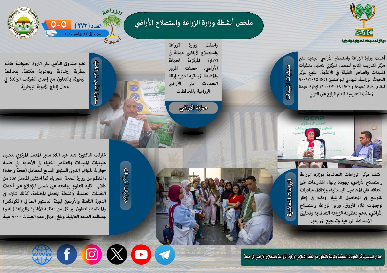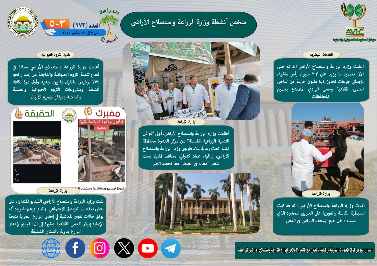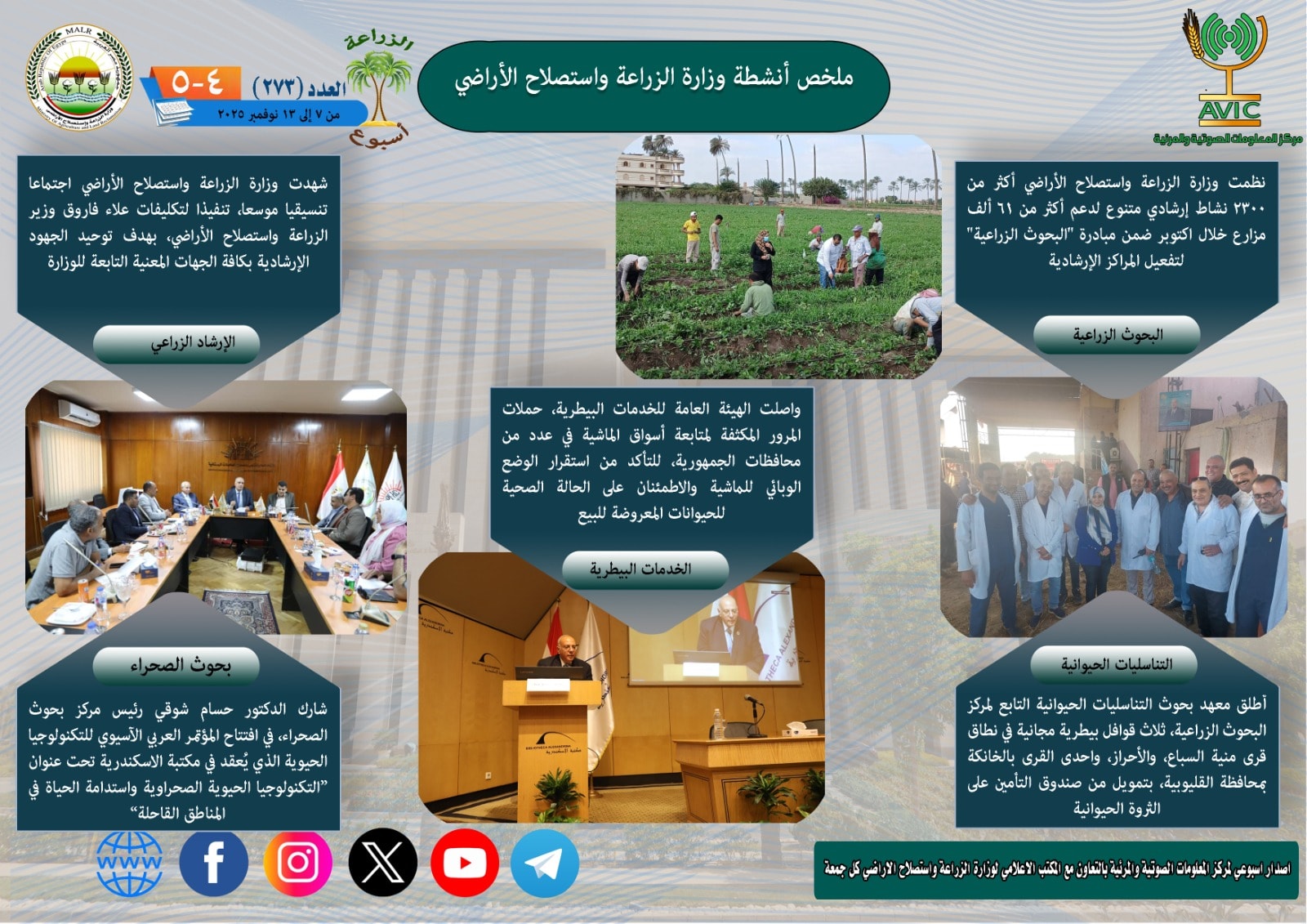 أصدر مركز المعلومات الصوتية والمرئية بوزارة الزراعة واستصلاح الأراضي، "الانفوجراف الاسبوعي" في نسخته رقم 273 حول الحصاد الاسبوعي لأهم أنشطة الوزارة، خلال الاسبوع الماضي في الفترة من 7 وحتى 13 نوفمبر الجاري، كما أصدر المركز ايضا ملخصا بالفيديو، حول انشطة الوزارة خلال نفس الفترة.