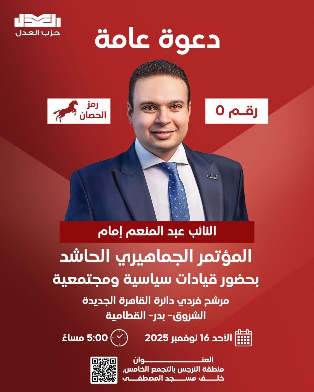 ينظم النائب عبد المنعم إمام رئيس حزب العدل ومرشح الحزب فى دائرة القاهرة الجديدة وبدر والشروق مؤتمرا جماهيريا فى منطقة النرجس ، بحضور عدد من القيادات السياسية والمجتمعية.