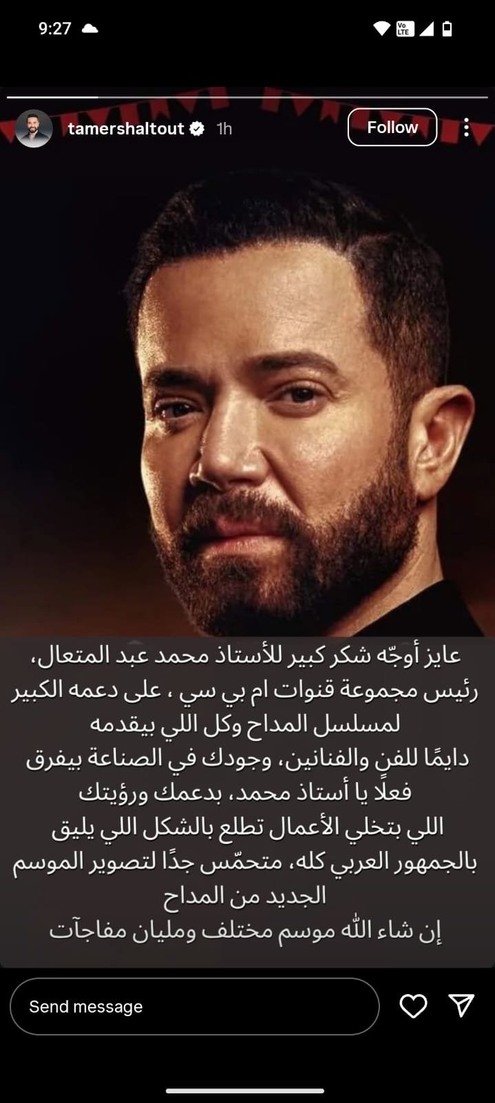 نشر النجم والإعلامي تامر شلتوت عبر صفحته الرسمية على موقع فيسبوك رسالة شكر وتقدير إلى الأستاذ محمد عبد المتعال، رئيس مجموعة قنوات MBC، أعرب فيها عن امتنانه الكبير لدعمه المتواصل لمسلسل المداح، ولما يقدمه دائمًا من دعم للفن والفنانين في الوطن العربي.