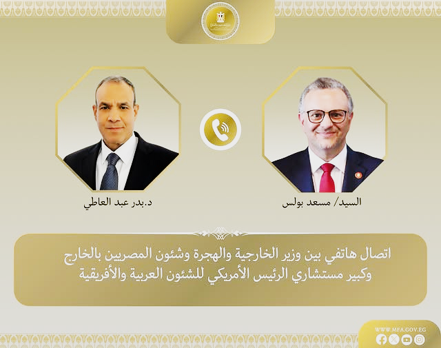 جرى اتصال هاتفى بين د. بدر عبد العاطي وزير الخارجية والهجرة وشئون المصريين بالخارج مع السيد مسعد بولس كبير مستشاري الرئيس الأمريكي للشئون العربية والأفريقية يوم السبت ١٥ نوفمبر.