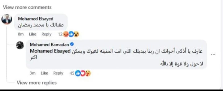 ما دفع محمد رمضان للرد عليه بنفسه قائلاً: "عارف يا أذكى إخواتك إن ربنا بيدّيلك اللي أنت اتمنيته لغيرك ويمكن أكتر.. لا حول ولا قوة إلا بالله."