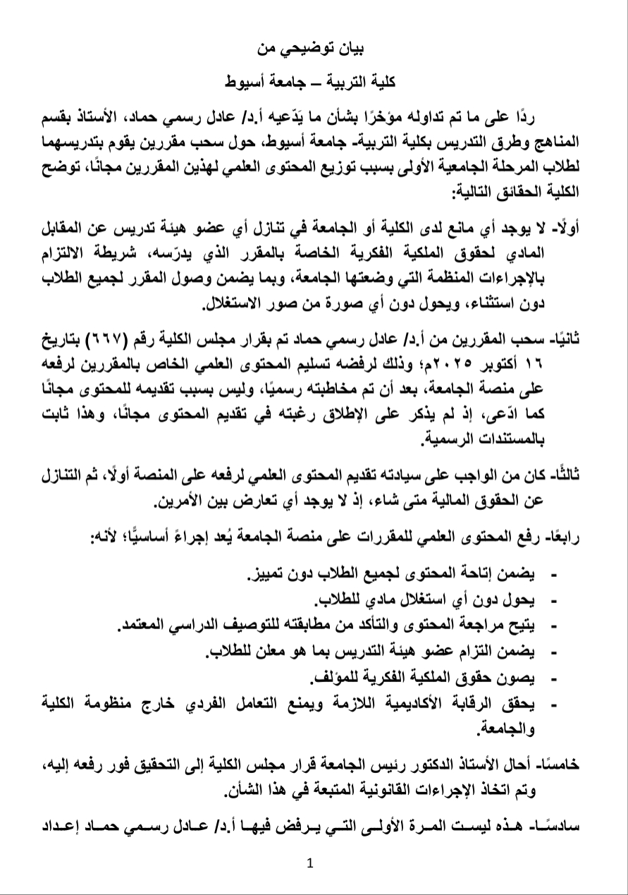 أصدرت كلية التربية بجامعة أسيوط بياناً توضيحياً شاملاً، للرد على الجدل المثار مؤخراً على مواقع التواصل الاجتماعي بشأن ادعاءات الأستاذ الدكتور عادل رسمي حماد، الأستاذ بقسم المناهج وطرق التدريس، حول سحب مقررين دراسيين كان يقوم بتدريسهما بسبب تقديمه المحتوى العلمي مجاناً للطلاب.