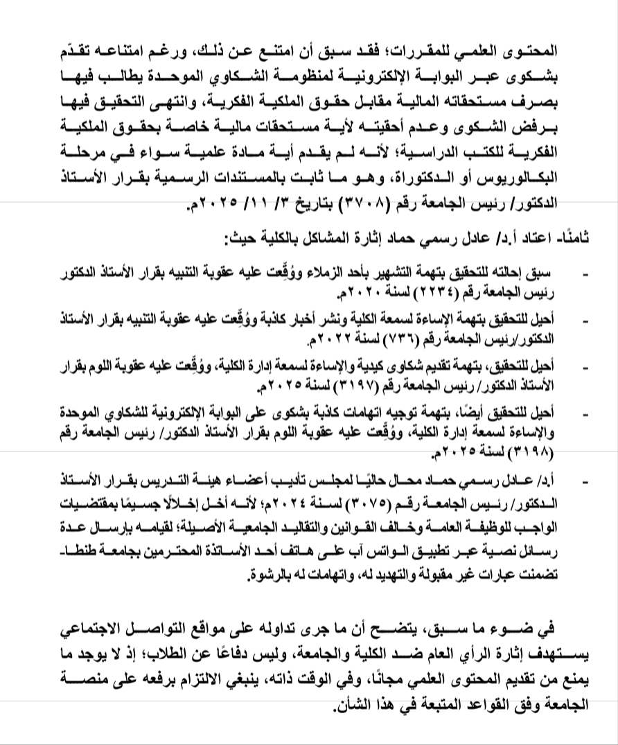 أوضح البيان أن سحب المقررين من الأستاذ الدكتور عادل رسمي حماد تم بموجب قرار مجلس الكلية رقم (667) بتاريخ 16 أكتوبر 2025، وأن السبب الجوهري وراء هذا الإجراء هو رفضه تسليم المحتوى العلمي الخاص بالمقررين لرفعه على منصة الجامعة، وذلك بعد مخاطبته رسمياً. وشددت الكلية على أن الأستاذ لم يذكر على الإطلاق رغبته في تقديم المحتوى مجاناً قبل سحب المقررين منه.