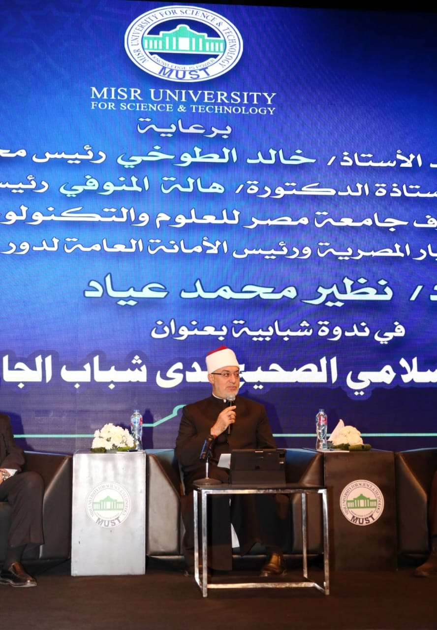 بالصور.. جامعة مصر للعلوم والتكنولوجيا تنظم ندوة "عودة الوعي الإسلامي الرشيد لشباب الجامعات" بحضور مفتي الجمهورية
