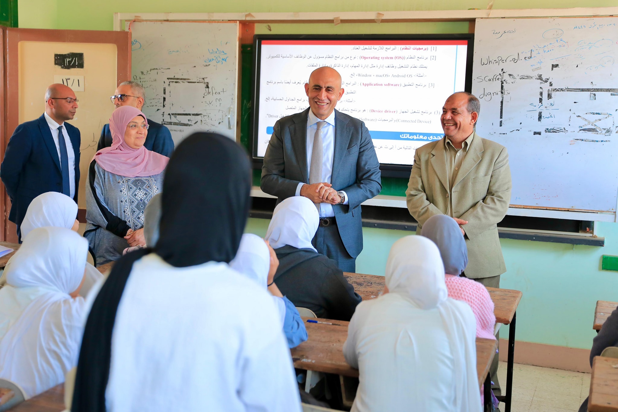 واختتم الوزير جولته التفقدية بزيارة مدرسة "الشهيد ملازم على سعد ذهنى الثانوية المشتركة" والتى تضم عدد ٨٢٧ طالبا وطالبة ، حيث حرص خلال تفقده على محاورته للطلاب حول طموحاتهم العلمية المستقبلية ومدى الاستفادة من التكنولوجيا الحديثة وأهمية دراستهم لمادة البرمجة عبر منصة "كيريو"، مؤكدا أن وزارة التربية والتعليم تهدف لإعداد جيل قادر على الإبداع وصانع للتكنولوجيا وليس مستخدما لها فقط.