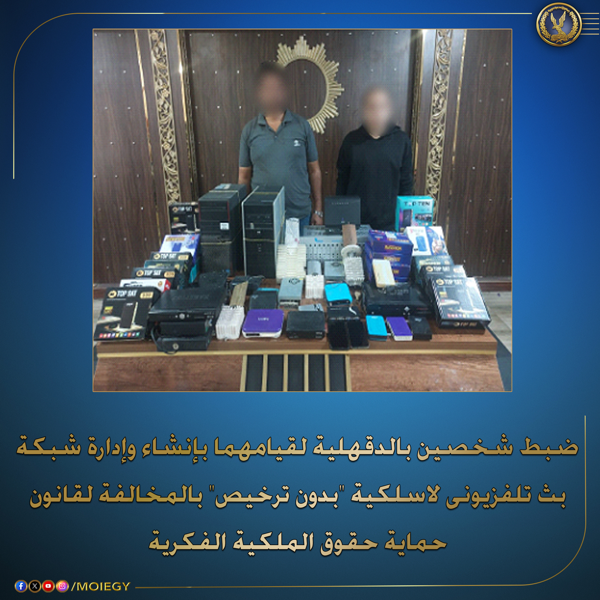 تستمر جهود مكافحة جرائم التعدي على حقوق الملكية الفكرية، حيث تمكنت الجهات المختصة من ضبط شخصين لقيامهما بإنشاء وإدارة شبكة بث تلفزيوني لاسلكية بدائرتي قسم شرطة المنصورة ومركز شرطة طلخا بمحافظة الدقهلية.