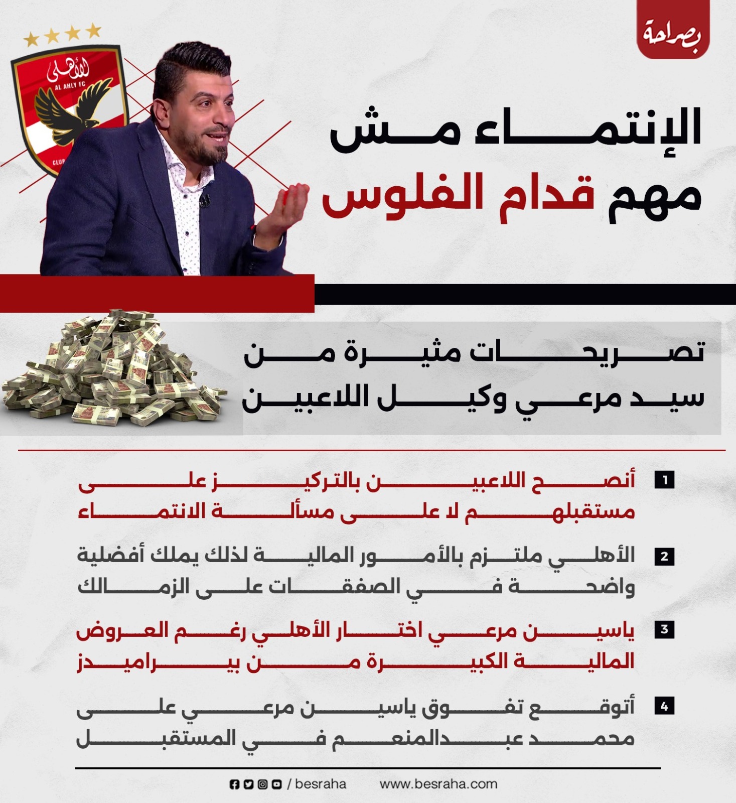 وأضاف :"التزام الأهلي بالملف المالي يمنحه أفضلية في صفقات عديدة، وانصح اللاعبين بما يخدم مستقبلهم فقط دون النظر للانتماءات.