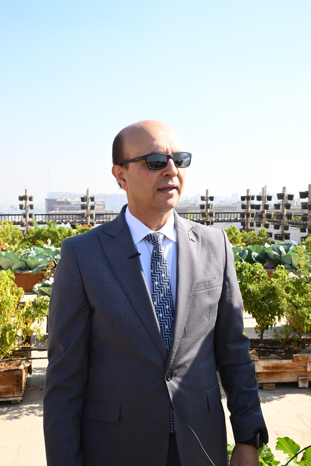 وأوضح رئيس الجامعة أن المشروع لا يمثل مجرد تجميل للمكان، بل هو تطبيق استراتيجي لرؤية مصر 2030 وسياسات وزارة التعليم العالي الداعمة للاقتصاد الأخضر، حيث تمكنت الجامعة من استغلال المساحات المهملة فوق الأسطح لتحويلها إلى وحدات إنتاجية توفر بيئة زراعية مستدامة، تساهم بشكل مباشر في خفض درجات الحرارة داخل المباني وتنقية الهواء، مما يقلل من آثار الاحتباس الحراري والبصمة الكربونية، مقدماً بذلك حلاً مبتكراً للزراعة لا يعتمد على استصلاح أراضي جديدة بل يستثمر المتاح بأعلى كفاءة ممكنة.