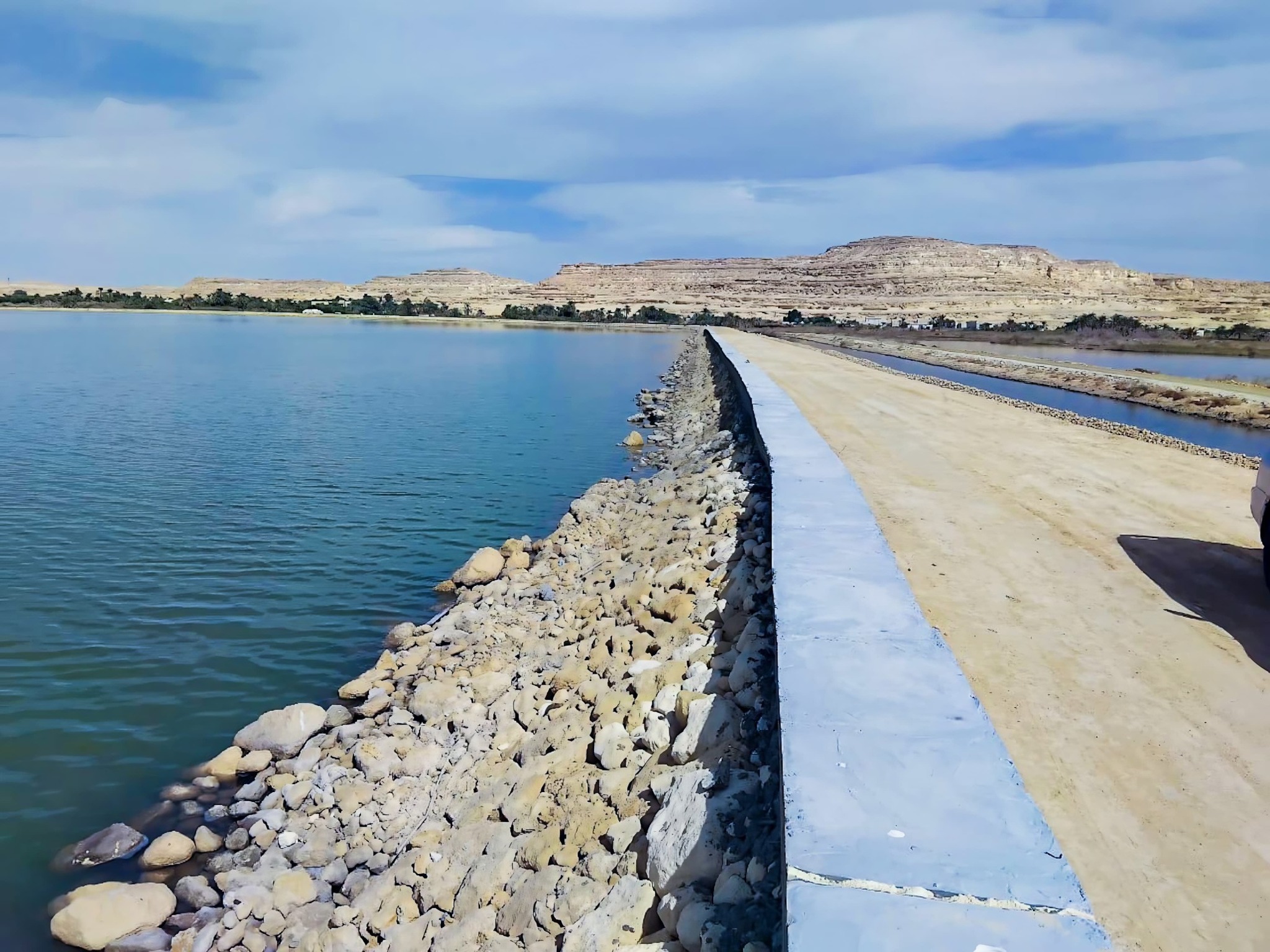 كما تم الإنتهاء من حفر عدد ١٢ بئر عميق لإنتاج المياه العذبة من خزان الحجر الرملي النوبي للخلط مع مياه الآبار السطحية، وفي المقابل تم غلق العديد من الآبار الجوفية والتى كانت تسحب المياه من الخزان الجوفى السطحي بشكل جائر، كما تم تنفيذ أعمال لتقوية وتعلية وتدعيم عدد (٤) جسور حول بحيرة سيوه بغرض تقليل الأضرار الناتجة عن إرتفاع مناسيب المياه خلال السنوات الماضية والتى أثرت سلباً على بعض الأراضى الزراعية والمبانى والمنشآت السياحية المطلة على البحيرة .