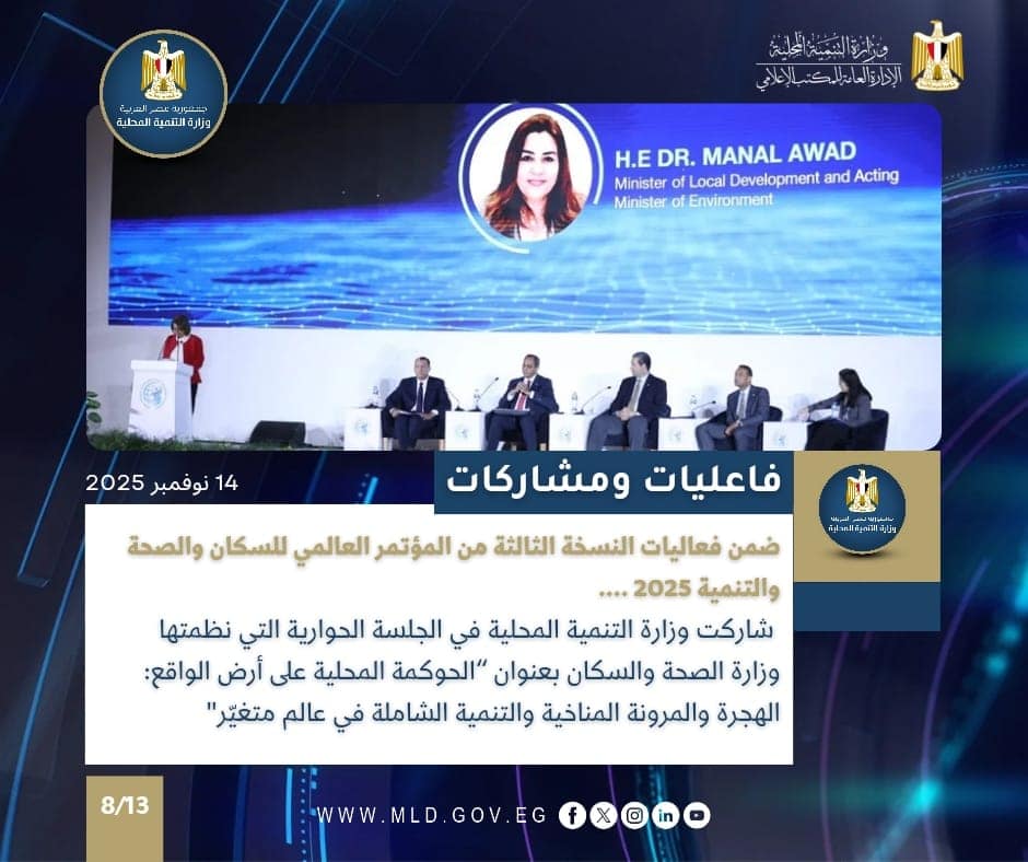 كما أعربت الدكتورة منال عوض وزيرة التنمية المحلية والقائم بأعمال وزير البيئة عن ترحيبها بالمشاركين في الجلسة الحوارية التي نظمتها وزارة الصحة والسكان بعنوان" الحوكمة المحلية على أرض الواقع: الهجرة والمرونة المناخية والتنمية الشاملة في عالم متغيّر"، مؤكدة أهمية التكامل بين الإنسان والبيئة والتنمية في إطار واحد متكامل، وذلك ضمن فعاليات النسخة الثالثة من المؤتمر العالمي للسكان والصحة والتنمية 2025، جاء ذلك خلال الكلمة التي ألقتها الدكتورة نجلاء العادلى المشرف على الإدارة العامة للتعاون الدولى والاتفاقيات نيابة عن وزيرة التنمية المحلية، حيث أدار الجلسة الدكتور هشام الهلباوي مساعد وزيرة التنمية المحلية للمشروعات القومية ومدير برنامج التنمية المحلية بصعيد مصر.