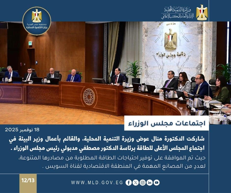 كما شاركت الدكتورة منال عوض وزيرة التنمية المحلية والقائم بأعمال وزير البيئة، في اجتماع المجلس الأعلى للطاقة، برئاسة الدكتور مصطفى مدبولي، رئيس مجلس الوزراء، وخلال الاجتماع، وافق على توفير احتياجات الطاقة المطلوبة من مصادرها المتنوعة، لعددٍ من المصانع المهمة في المنطقة الاقتصادية لقناة السويس، بينها مشروعات جديدة، وتوسعات لمشروعات قائمة، في عددٍ من القطاعات الإنتاجية والحيوية.