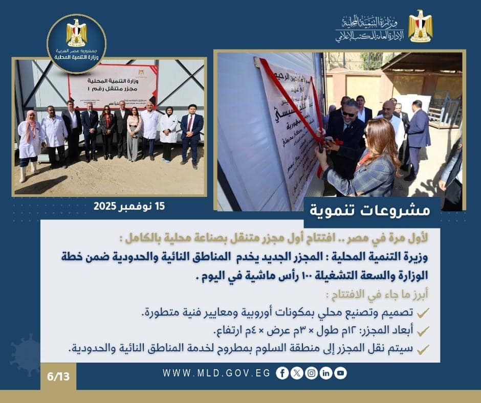 افتتحت الدكتورة منال عوض وزيرة التنمية المحلية والقائم بأعمال وزير البيئة، المجزر المتنقل الأول والذى يتم تنفيذه لأول مرة في مصر وتشرف الوزارة علي تصميمه وتمويله ضمن عقد توريد 2 مجزر متنقل مكيف ومجهز بجميع مشتملاته بين وزارة التنمية المحلية وشركة (بان) للمقاولات العامة والاستثمار التجاري ، وذلك بناءً علي توجيهات السيد الدكتور مصطفي مدبولي رئيس مجلس الوزراء لوزارة التنمية المحلية بتجهيز عدد ٢ مجزر متنقل مكيف لذبح الأبقار والماشية التي توجد بمناطق لا يوجد بها مجازر وكذا المناطق النائية والحدودية للتعامل مع الماشية التي يتم استيرادها من الخارج لتوفير لحوم آمنة لتلبية احتياجات المواطنين .