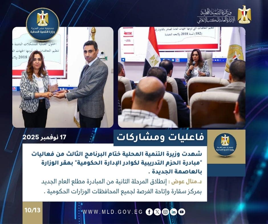 أعلنت الدكتورة منال عوض وزيرة التنمية المحلية، عن انطلاق البرنامج التدريبي الثالث من مبادرة "الحزم التدريبية لكوادر الإدارة الحكومية"، والذي يعقد خلال الفترة من 16 إلى 18 نوفمبر 2025 بمقر الوزارة بالعاصمة الجديدة، بحضور عدد من قيادات وزارة التنمية المحلية ومركز التنمية المحلية للتدريب بسقارة وذلك تحت عنوان “أساسيات قانون التعاقدات رقم 182 لسنة 2018”.