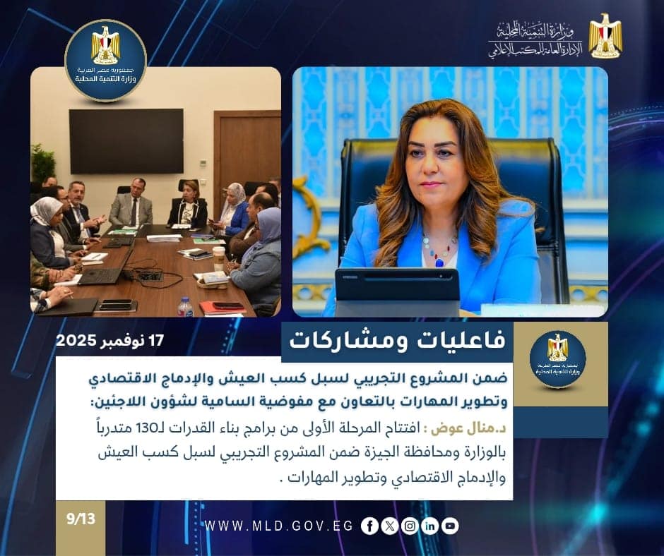 وأعلنت الدكتورة منال عوض وزيرة التنمية المحلية، عن إطلاق الوزارة بالتعاون مع المفوضية السامية للأمم المتحدة لشؤون اللاجئين UNHCR))، وبالشراكة مع منظمة بلان إنترناشونال المرحلة الأولى من المشروع التجريبي لسبل كسب العيش والإدماج الاقتصادي وتطوير المهارات خلال الفترة من 2025 إلى 2027.
