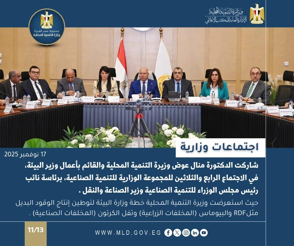 كما شاركت الدكتورة منال عوض وزيرة التنمية المحلية والقائم بأعمال وزير البيئة، في الاجتماع الرابع والثلاثين للمجموعة الوزارية للتنمية الصناعية، برئاسة الفريق مهندس/ كامل الوزير، نائب رئيس مجلس الوزراء للتنمية الصناعية وزير الصناعة والنقل، وخلال الاجتماع استعرضت وزيرة التنمية المحلية خطة وزارة البيئة لتوطين إنتاج الوقود البديل مثل RDF والبيوماس (المخلفات الزراعية) وتفل الكرتون (المخلفات الصناعية) حيث تم إنشاء بنية تحتية قوية.