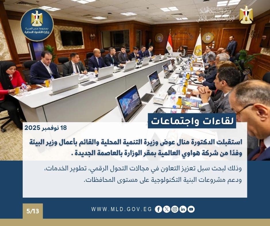 استقبلت الدكتورة منال عوض وزيرة التنمية المحلية والقائم بأعمال وزير البيئة، وفداً من شركة هواوي برئاسة صامويل شو نائب رئيس الوحدة الرقمية للخدمات العامة لشركة هواوي العالمية ومن شركة هواوي مصر كل من وانج يانج الرئيس التنفيذي لإدارة المؤسسات وليون ليو مدير التطوير الإقليمي لشركة هواوي في شمال أفريقيا وذلك بحضور عدد من قيادات وزارتي البيئة و التنمية المحلية وذلك بمقر الوزارة بالعاصمة الجديدة لبحث مجالات التعاون المشترك .