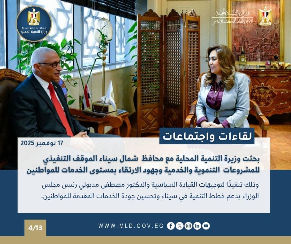 عقدت الدكتورة منال عوض وزيرة التنمية المحلية، اجتماعًا مع اللواء خالد مجاور محافظ شمال سيناء بمقر الوزارة بالعاصمة الجديدة، لمتابعة الموقف التنفيذي للمشروعات التنموية والخدمية التي يجري تنفيذها علي أرض مراكز ومدن المحافظة، وذلك في إطار توجيهات القيادة السياسية وتكليفات رئيس مجلس الوزراء بدفع جهود التنمية في سيناء وتعزيز الخدمات المقدمة للمواطنين.