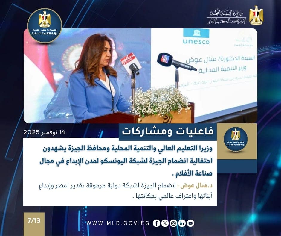 شهد كل من د.أيمن عاشور وزير التعليم العالي والبحث العلمي رئيس اللجنة الوطنية المصرية لليونسكو، ود.منال عوض وزيرة التنمية المحلية والقائم بأعمال وزير البيئة، وم.عادل النجار محافظ الجيزة، احتفال محافظة الجيزة بانضمامها إلى شبكة اليونسكو لمدن الإبداع في مجال صناعة الأفلام لعام 2025، بحضور عدد من قيادات الوزارتين والمحافظة، وممثلي المؤسسات الوطنية والمنظمات الدولية.