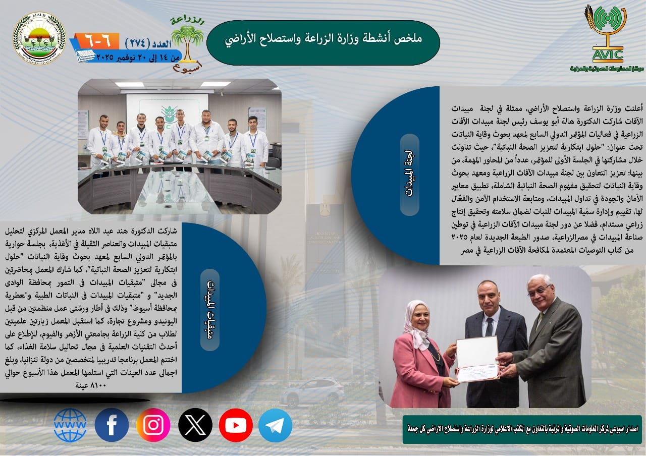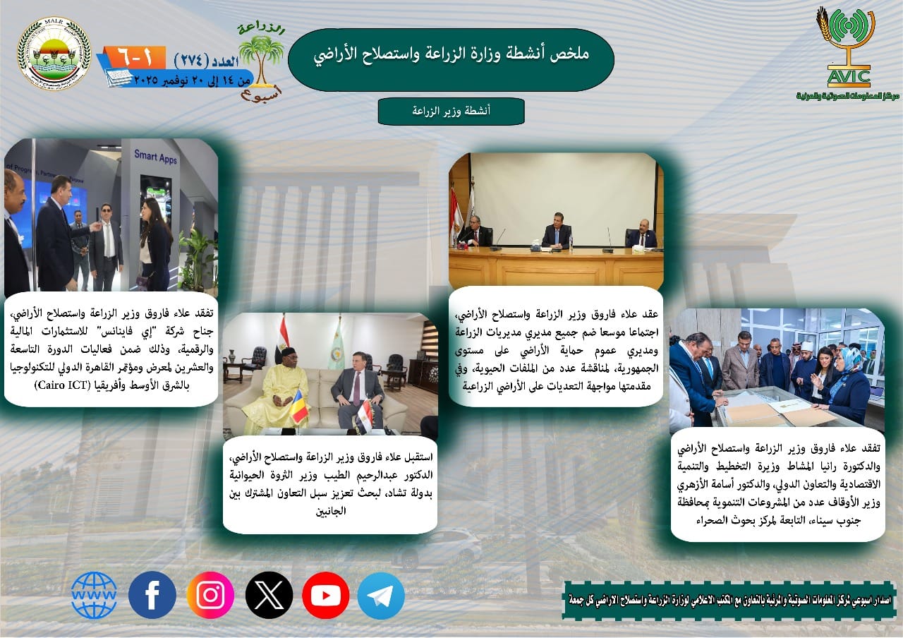 يذكر ان مركز المعلومات الصوتية والمرئية، والمكتب الاعلامي للوزارة، يصدران الجمعة من كل اسبوع، انفوجرافا وفيديو باسم: الزراعة في اسبوع، لالقاء الضوء على ملخص ما تم من انشطة وجهود، بكافة القطاعات والهيئات، التابعة للوزارة، فضلا عن انفوجراف وفيديو كل ثلاثاء باسم: الزراعة في كل مصر، حول انشطة وجهود القطاع الزراعي، بالمحافظات المختلفة.
