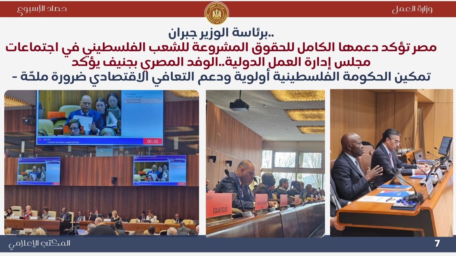 وترأس الوزير – بصفته رئيس مجلس إدارة منظمة العمل العربية – اجتماع المجموعة العربية، مؤكدًا أهمية التكامل العربي والتنسيق المشترك، ودعم القضايا العمالية العربية، وعلى رأسها دعم العمالة الفلسطينية وتعزيز التعاون العربي الدولي.