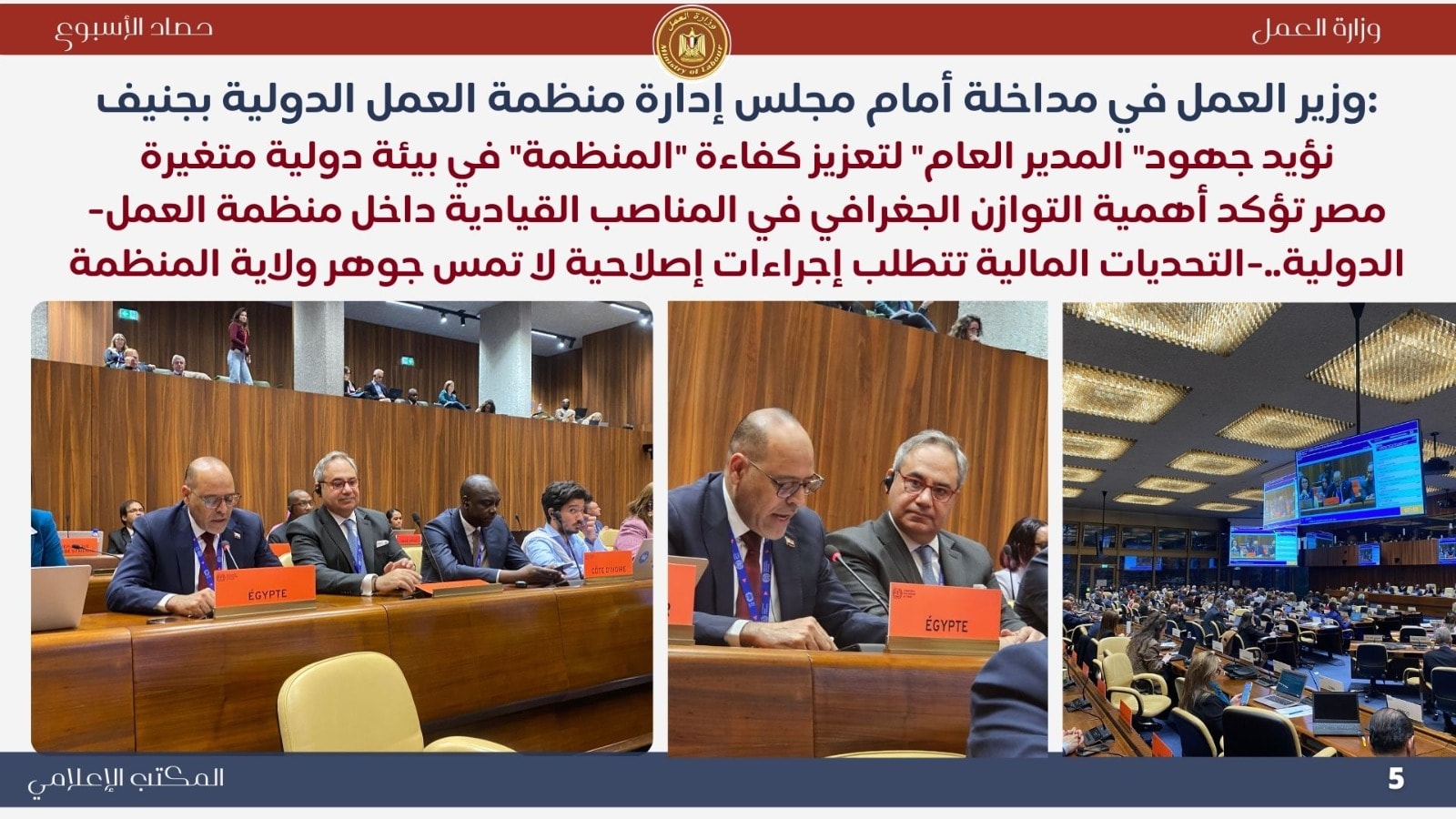 وأكد الوزير في مداخلته دعم مصر لمسار إصلاح المنظمة، وأهمية التوازن الجغرافي في المناصب القيادية، وتعزيز القدرات الإقليمية، والحفاظ على الطبيعة الثلاثية للمنظمة.
