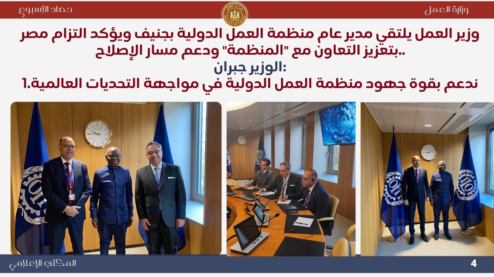 واستعرض الوزير أمام جيلبرت هونغبو رؤية مصر لتطوير سوق العمل، والبرنامج القطري للعمل اللائق، والاستراتيجية الوطنية للتشغيل، وتطوير السلامة والصحة المهنية، وتحويل برنامج "العمل الأفضل" إلى برنامج دائم.