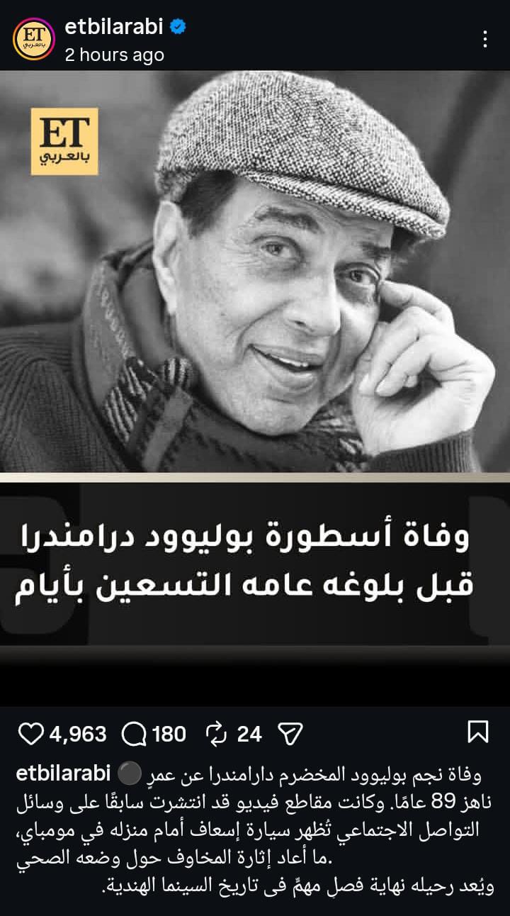 توفى منذ قليل نجم السينما الهندية درامندرا ديول عن عمر ناهز الـ 89 عاما إثر تعرضه لأزمة صحية كبيرة منذ أسابيع.