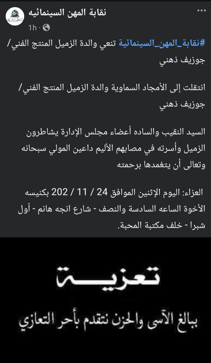 وكتبت المهن السينمائية منشور جاء كالتالي: " نقابة المهن السينمائية تنعي والدة الزميل المنتج الفني جوزيف ذهني