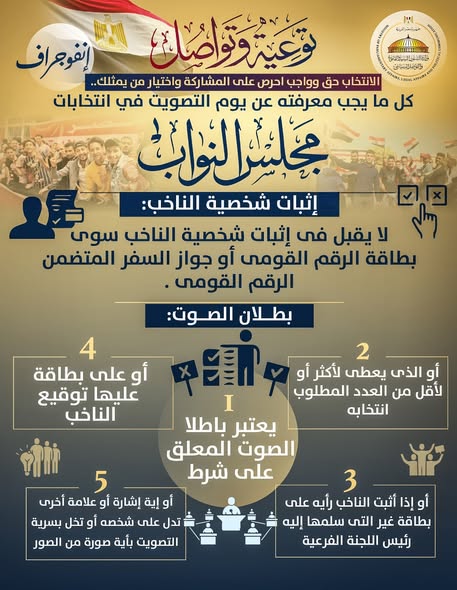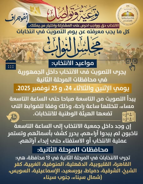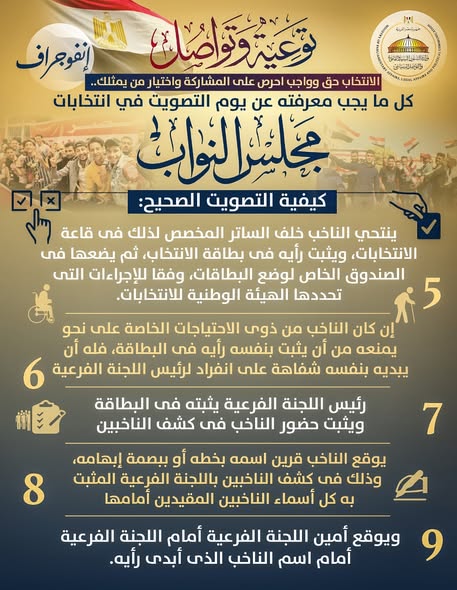 أصدرت وزارة الشئون النيابية انفوجرافات حول الانتخابات تحت عنوان “الانتخاب حق وواجب احرص عل المشاركة.. كل ما يجب معرفته عن يوم التصويت في المرحلة الثانية من انتخابات مجلس النواب”.
