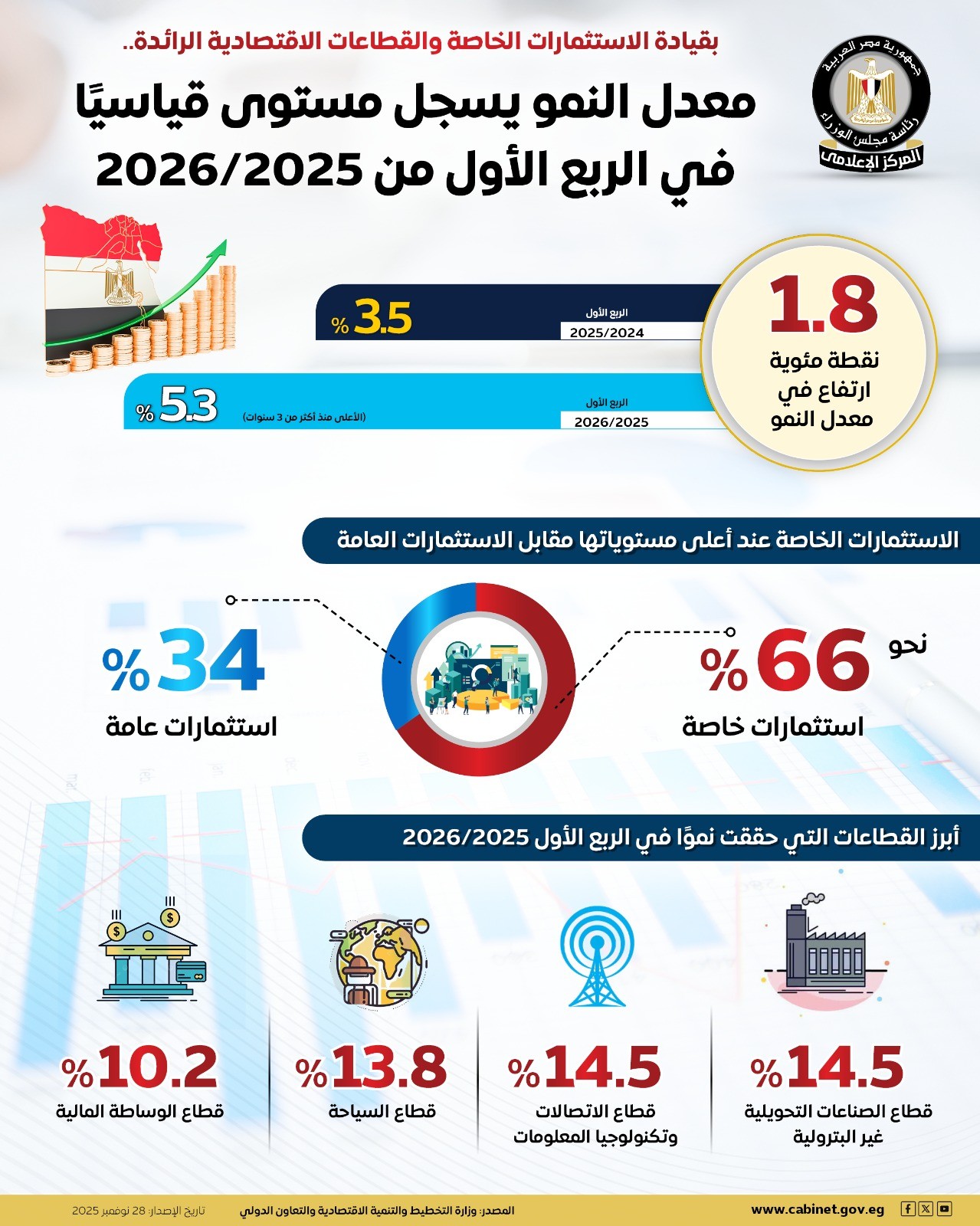 أعلن الجهاز المركزي للتعبئة العامة والإحصاء أن الاقتصاد المصري شهد نمواً ملحوظاً في الربع الأول من العام المالي 2026/2025، حيث ارتفع الناتج المحلي الإجمالي بنسبة 5.3%، وهو أعلى معدل نمو يسجله الاقتصاد المصري منذ أكثر من ثلاث سنوات.