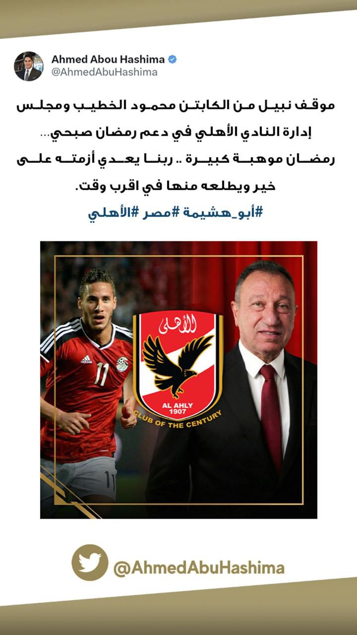 ويأتي إشادة أبو هشيمة في ظل حالة تضامن واسعة من جماهير الكرة المصرية مع رمضان صبحي، بعد الخطوة التي اتخذتها إدارة الأهلي لمساندته قانونيًا وإنسانيًا.