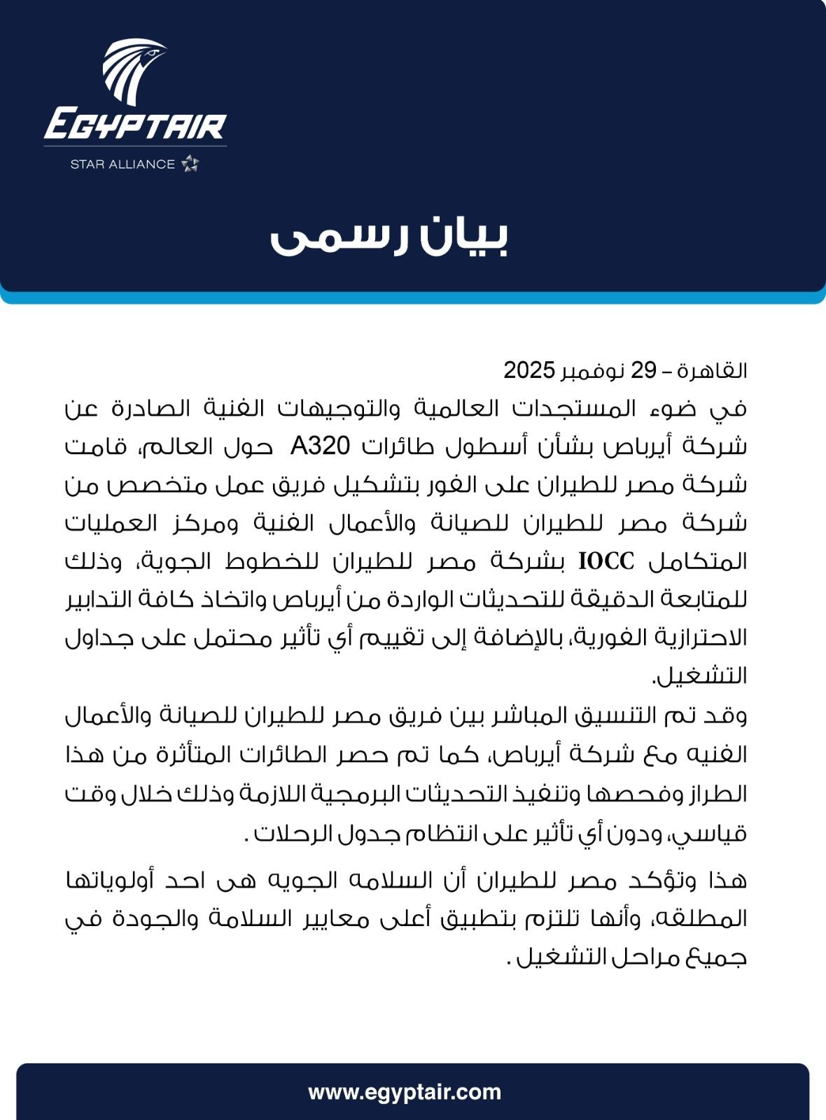 في ضوء المستجدات العالمية والتوجيهات الفنية الصادرة عن شركة أيرباص بشأن أسطول طائرات A320 حول العالم، قامت شركة مصر للطيران على الفور بتشكيل فريق عمل متخصص من شركة مصر للطيران للصيانة والأعمال الفنية ومركز العمليات المتكامل IOCC بشركة مصر للطيران للخطوط الجوية، وذلك للمتابعة الدقيقة للتحديثات الواردة من أيرباص واتخاذ كافة التدابير الاحترازية الفورية، بالإضافة إلى تقييم أي تأثير محتمل على جداول التشغيل.