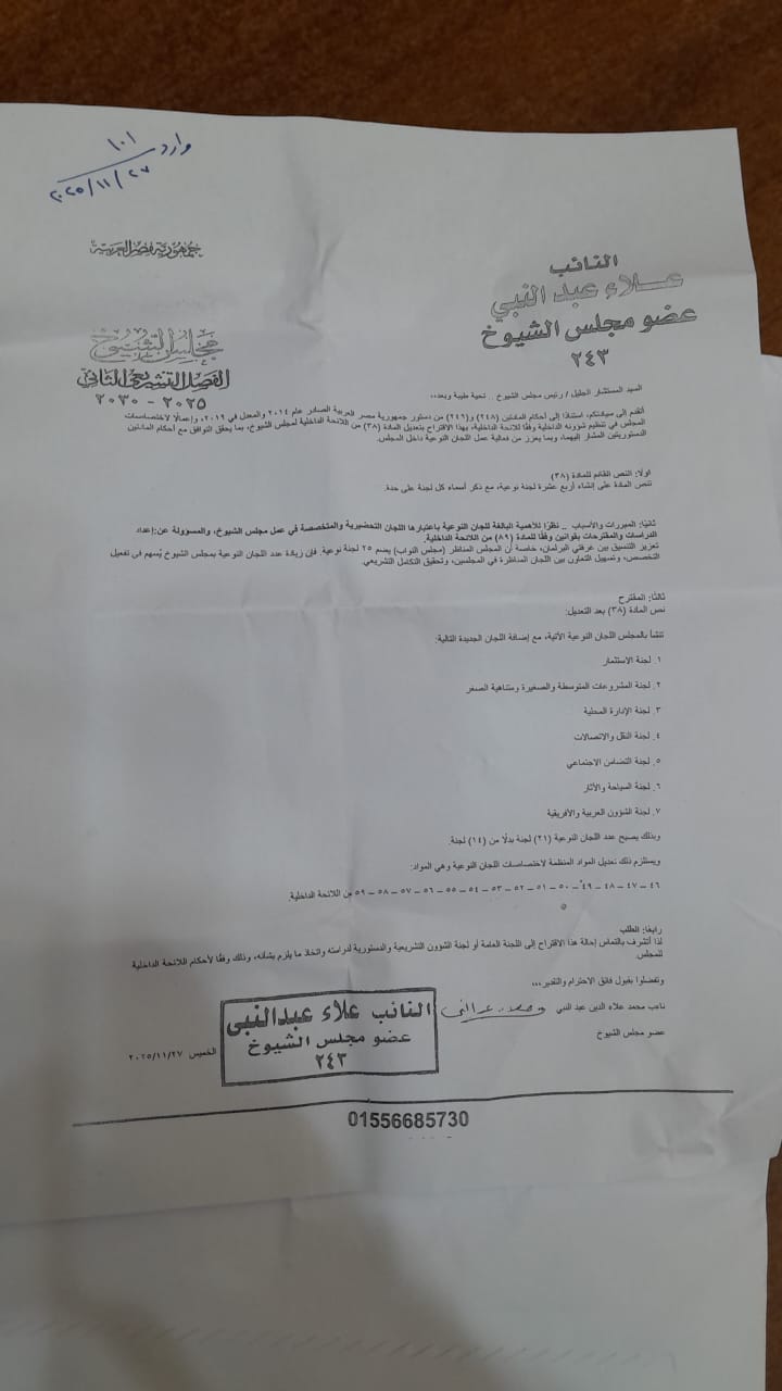 تقدّم النائب علاء عبد النبي، وكيل لجنة الزراعة والري والأمن الغذائي بمجلس الشيوخ، باقتراح رسمي إلى المستشار رئيس مجلس الشيوخ، يطلب فيه تعديل المادة (38) من اللائحة الداخلية للمجلس، وذلك استنادًا إلى المادتين (248) و(249) من دستور 2014 والمعدل في 2019، وبما ينسجم مع اختصاصات المجلس في تنظيم شؤونه الداخلية.