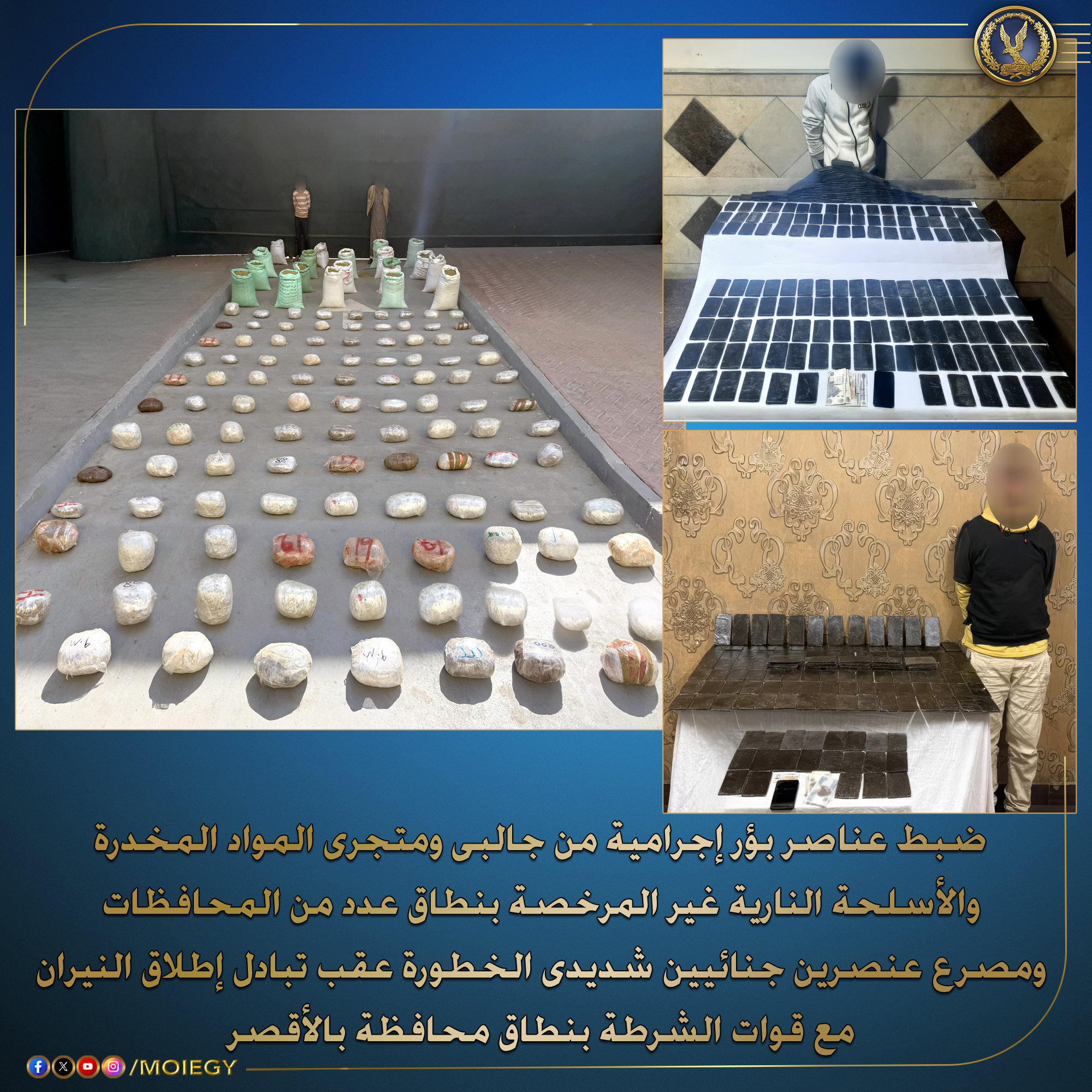 ضبط عناصر بؤر إجرامية من جالبى ومتجرى المواد المخدرة والأسلحة النارية غير المرخصة بنطاق عدد من المحافظات ومصرع عنصرين جنائيين شديدى الخطورة عقب تبادل إطلاق النيران مع قوات الشرطة بنطاق محافظة بالأقصر.
