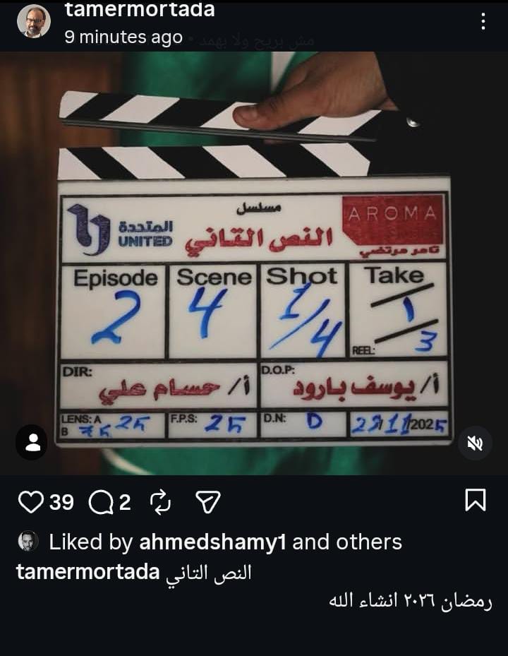 ونشر المنتج تامر مرتضى صورة لكلاكيت يحمل إسم المسلسل عبر حسابه بموقع تبادل الصور والفيديوهات "انستجرام"، وعلق عليها قائلا: "النص التاني، رمضان 2026.
