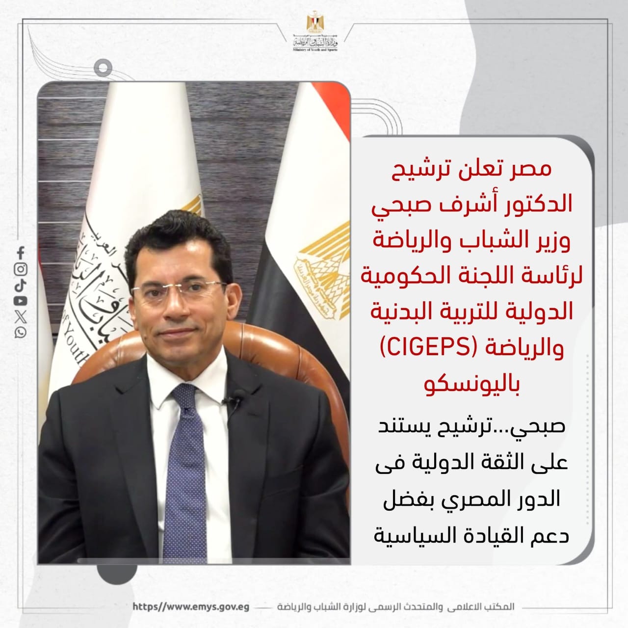 أعلنت وزارة الشباب والرياضة ترشيح مصر الدكتور أشرف صبحي، وزير الشباب والرياضة، لرئاسة اللجنة الحكومية الدولية للتربية البدنية والرياضة (CIGEPS) التابعة لمنظمة اليونسكو، وذلك خلال فعاليات مؤتمر سانتياجو الدولي للرياضة الدامجة والتربية البدنية المُنعقد في العاصمة التشيلية سانتياجو، والذي تُنظمه وزارة الرياضة في تشيلي بالتعاون مع منظمة اليونسكو، بمشاركة وزراء ومسؤولين وخبراء من مختلف دول العالم.