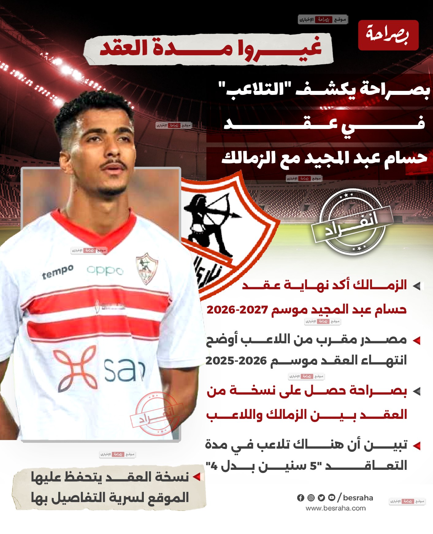 وقد حصل موقع بصراحة على مستند يؤكد حدوث تلاعب بالفعل في عقد حسام عبد المجيد مع نادي الزمالك، بتغيير مدة التعاقد من 4 سنوات إلى 5 سنوات.