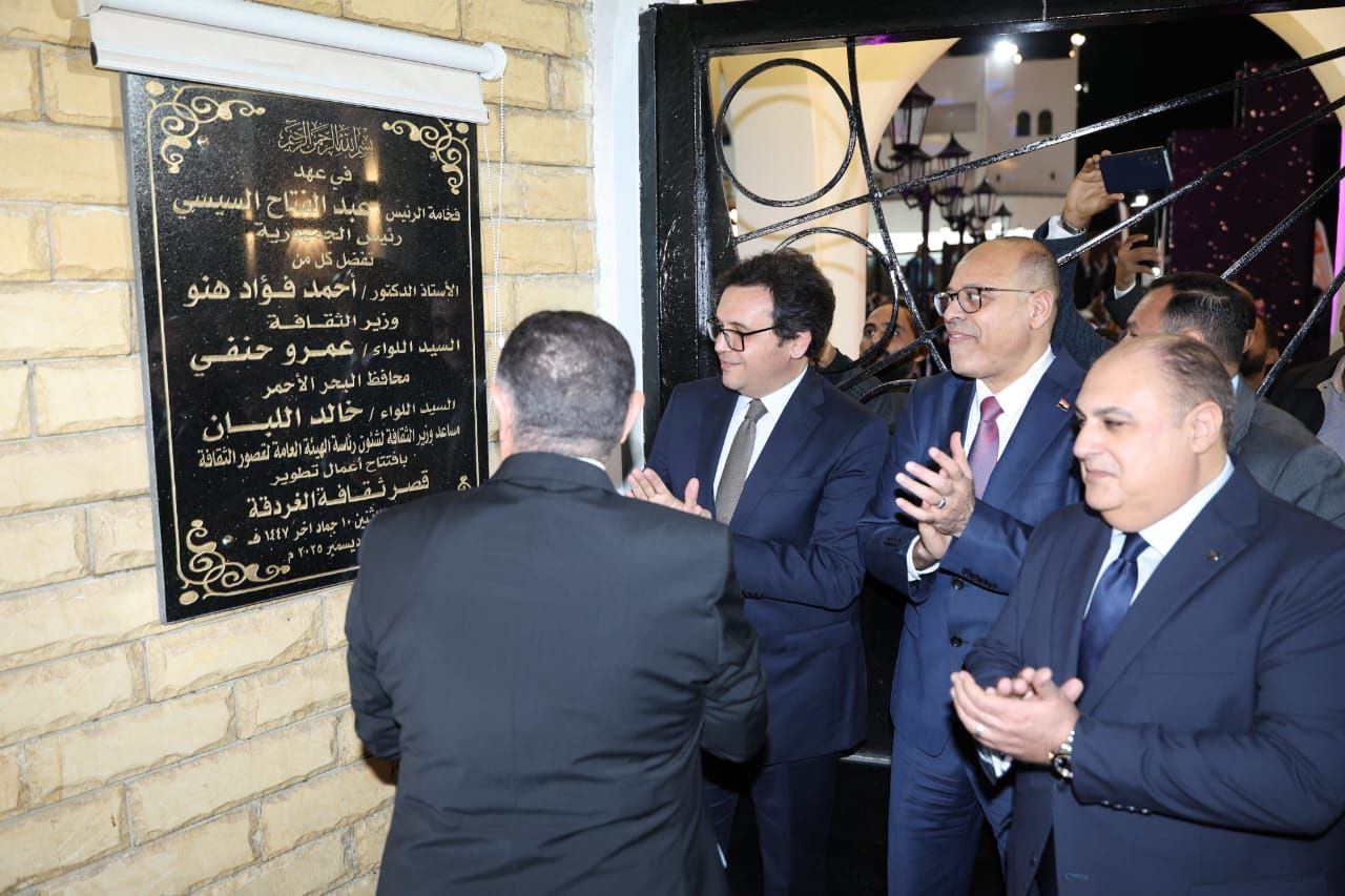وسط حضور جماهيري كبير من أبناء محافظة البحر الأحمر، افتتح الدكتور أحمد فؤاد هَنو، وزير الثقافة، واللواء عمرو حنفي، محافظ البحر الأحمر، بحضور السيد محمد جبران وزير العمل ،"قصر ثقافة الغردقة” التابع للهيئة العامة لقصور الثقافة، برئاسة اللواء خالد اللبان وذلك بعد الانتهاء من أعمال الإحلال والتجديد والتطوير الشاملة التي شملت المبنى الإداري ومبنى الأنشطة والمسرح الكبير والفندق الملحق بالمركز الثقافي “KEMET LODGE”، وفق أحدث النظم الفنية والتقنية.