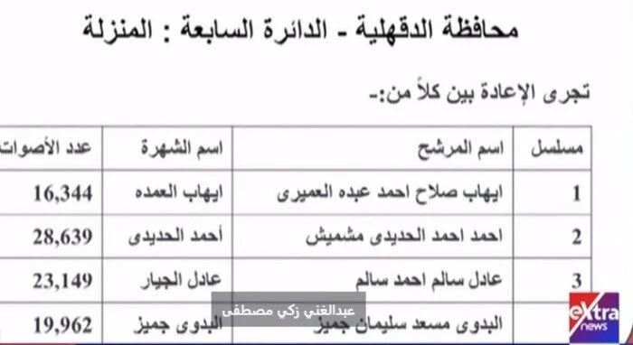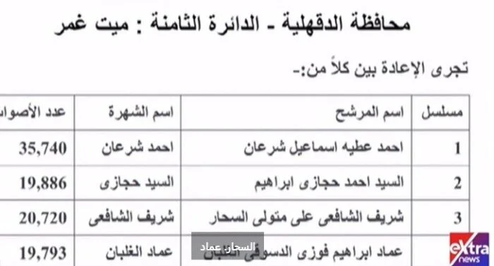 تُجرى جولة الإعادة في الدائرة الثامنة بميت غمر بين أحمد شرعان، والسيد حجازي، وشريف الشافعي، وعماد الغلبان.