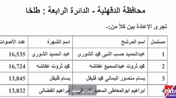 وتجرى الإعادة في الدائرة الرابعة بطلخا بين كل من عبد الحميد الشورى ومحمد ثروت عكاشة وبسام فليفل وإبراهيم الفضالي.