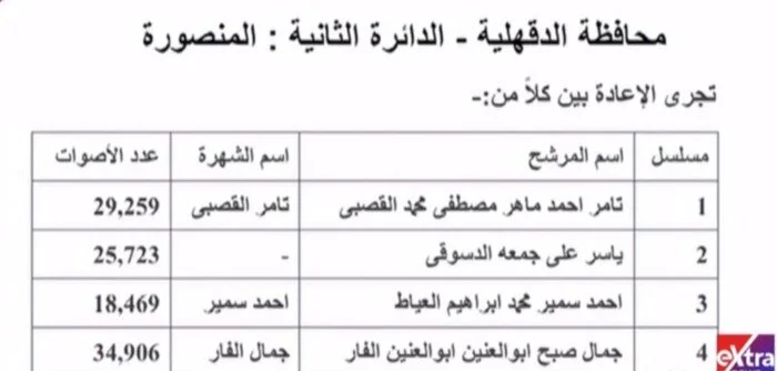 أما في الدائرة الثانية «المنصورة»، فتُجرى جولة الإعادة بين تامر القصبي وياسر علي جمعة وأحمد سمير وجمال الفار.