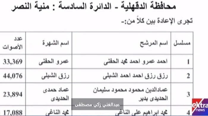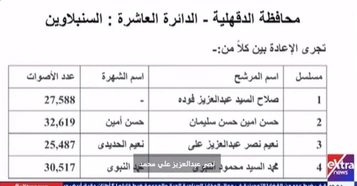 تُجرى جولة الإعادة في الدائرة العاشرة بالسنبلاوين بين صلاح السيد، وحسن أمين، ونعيم الحديدي، ومحمد النبوي.