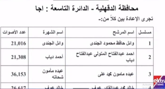 تُجرى جولة الإعادة في الدائرة التاسعة بأجا بين وائل الجندي، وأحمد دياب، وعبدة مأمون شحاته، وخالد عوف.