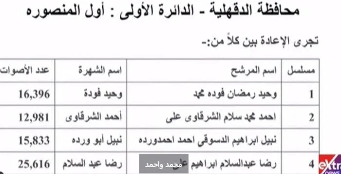 وأوضحت الهيئة أن نتائج الدائرة الأولى بقسم أول المنصورة بمحافظة الدقهلية أسفرت عن إجراء الإعادة بين كل من وحيد فودة، وأحمد الشرقاوي، ونبيل أبو وردة، ورضا عبد السلام.