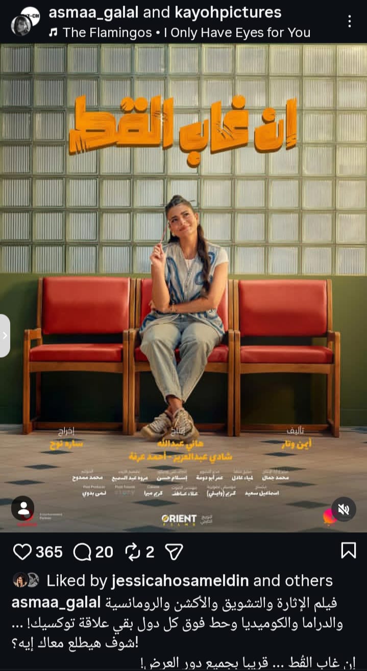 ونشرت أسماء جلال البوستر عبر حسابها بموقع تبادل الصور والفيديوهات "انستجرام"، وعلقت عليه قائلة: "فيلم الإثارة والتشويق والأكشن والرومانسية والدراما والكوميديا، وحط فوق كل دول بقى علاقة توكسيك، شوف هيطلع معاك إيه".