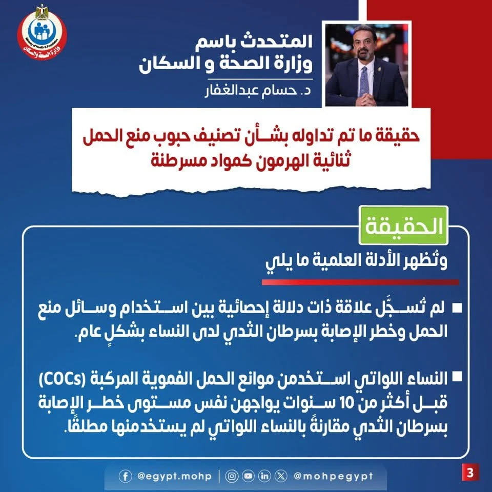 وقال الدكتور حسام عبد الغفار المتحدث باسم وزارة الصحة والسكان: لم تُسجل علاقة ذات دلالة إحصائية بين استخدام وسائل منع الحمل وخطر الإصابة بسرطان الثدي لدى النساء بشكل عام.