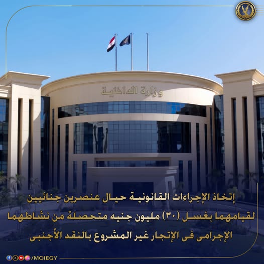 في إطار مكافحة جرائم الأموال العامة والجريمة المنظمة، وبالتنسيق مع أجهزة الوزارة المعنية، تم اتخاذ الإجراءات القانونية حيال عنصرين جنائيين لقيامهما بغسل الأموال المتحصلة من نشاطهما الإجرامي في الإتجار غير المشروع بالنقد الأجنبي.