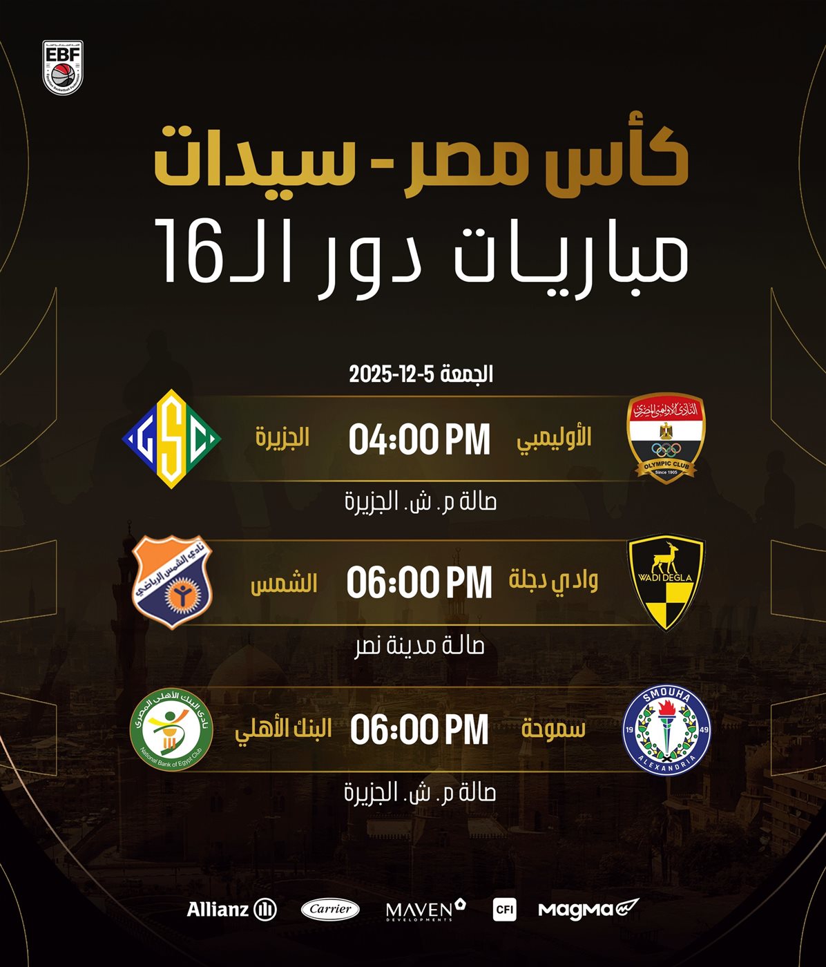 تنطلق يوم الجمعة المقبل، الموافق 5 ديسمبر 2025، منافسات دور الـ16 من بطولة كأس مصر لسيدات كرة السلة، والتي ينظمها الاتحاد المصري لكرة السلة (EBF)، وسط حالة من الترقب والحماس بين الفرق المشاركة والجماهير المتابعة للعبة، وتشهد هذه المرحلة مواجهات قوية تجمع بين أندية لها تاريخ كبير في المنافسة على البطولات وأخرى تطمح لفرض نفسها والوصول إلى الأدوار النهائية للمرة الأولى.